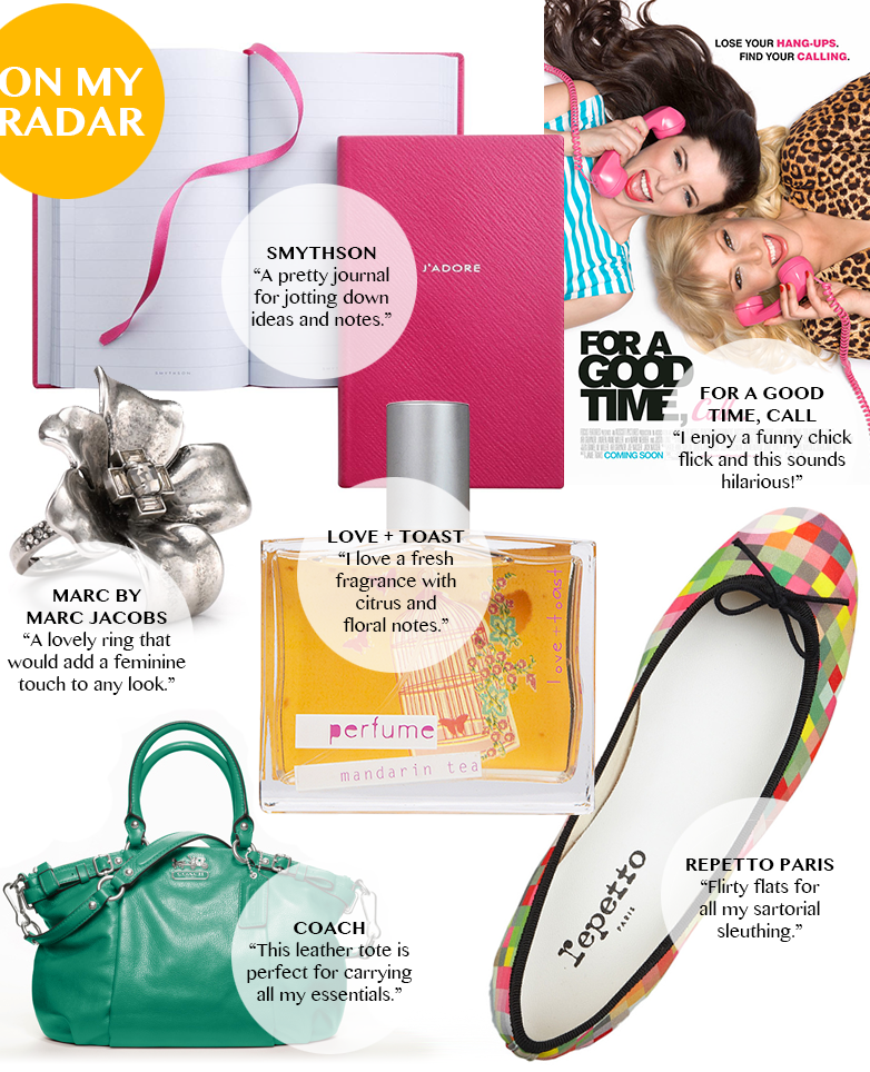 Smythson "J'adore" Panama notebook, $80; Marc by Marc Jacobs flower ring, $98; Love + Toast "Mandarin Tea" perfume, $28; Coach Madison leather "Sophia" satchel, $358; Repetto Paris "BB" printed canvas ballet flats, $265; and "For A Good Time, Call" movie.